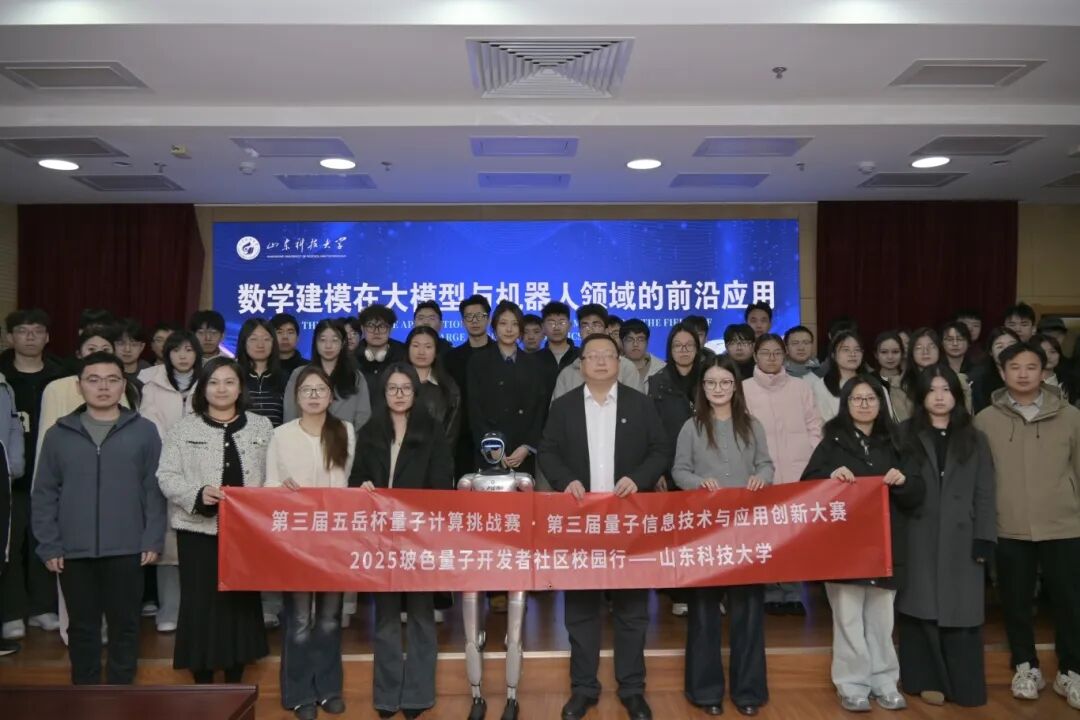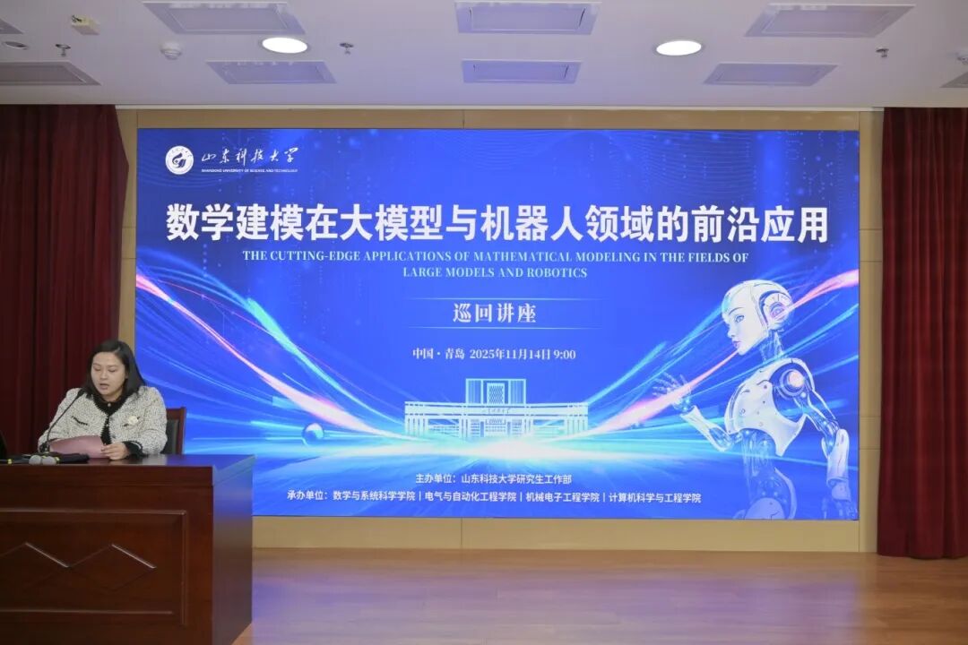 2025年11月14日上午,山东科技大学“数学建模在大模型与机器人领域的前沿应用”巡回讲座在图书馆尚学讲堂圆满落下帷幕。本次讲座由山东科技大学研究生工作部主办,数学与系统科学学院、电气与自动化工程学院、机械电子工程学院、计算机科学与工程学院联合承办。研究生工作部刘瑞雪老师、付蕾老师、天树探界(北京)科技有限公司陈鑫老师、玻色量子科技有限公司杨璧园老师,以及相关学院学生代表等出席了此次活动。