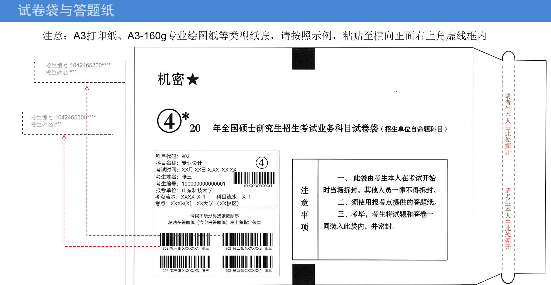 3.条形码粘贴要求:请将自命题试题信封封面上的条形码撕下,按照顺序粘贴在绘图纸正面右上角7cm×2cm范围内位置(详见附件)。若发现条形码损坏、缺失等特殊情况,考生可在该位置直接手写考生编号+姓名。